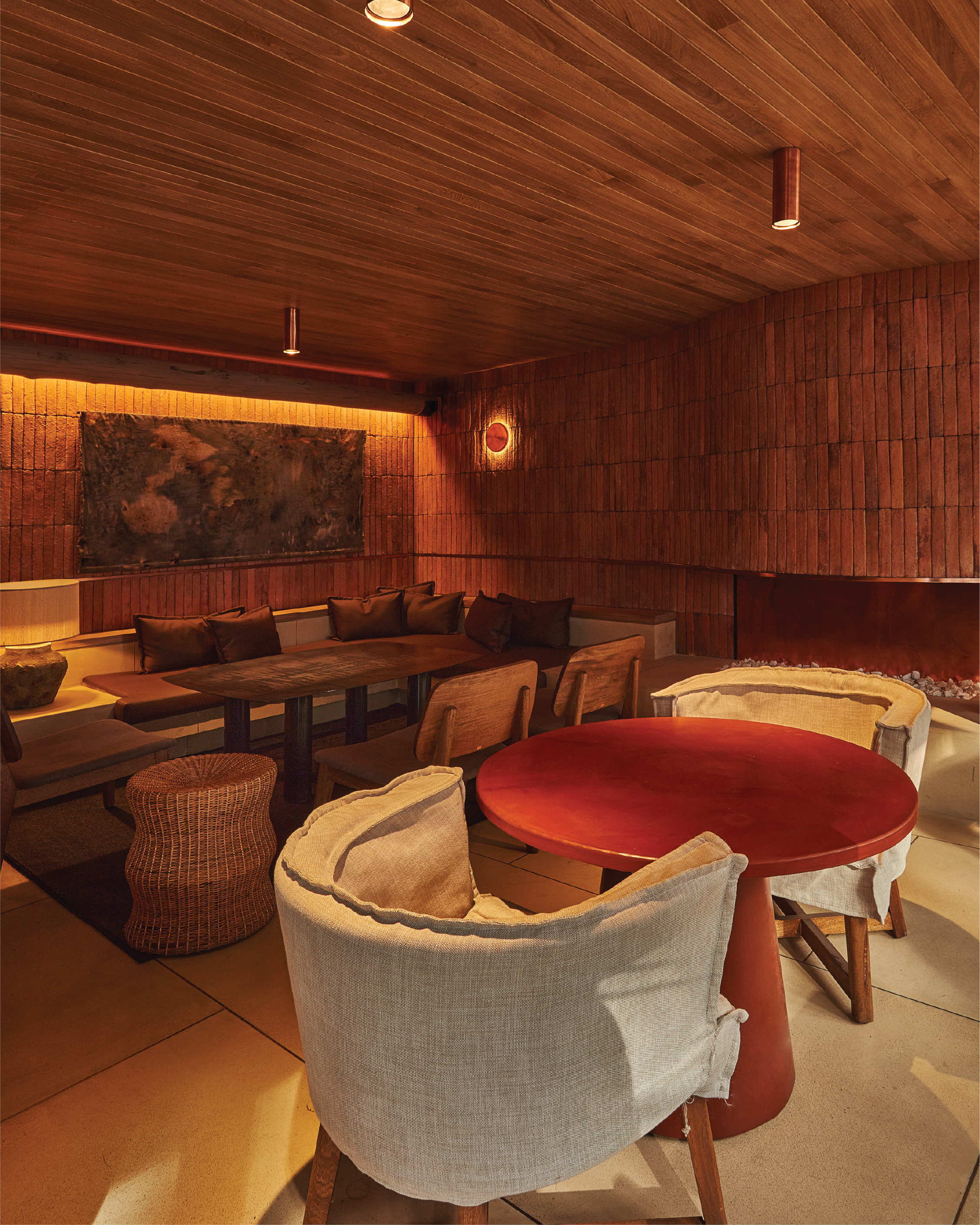 De esta manera Martín fue vistiendo los distintos espacios desde la unidad conceptual, pero también resaltando las características de cada lugar con piezas de diseño colombiano como mesas de Carmworks y 902 Showroom (en materiales tan inusuales como la terracota), el arte textil de Vanessa Valero, lámparas de su marca mm&co y otras desarrolladas en colaboración con La Bestial, así como sillas y bancas de madera con Vrokka.
