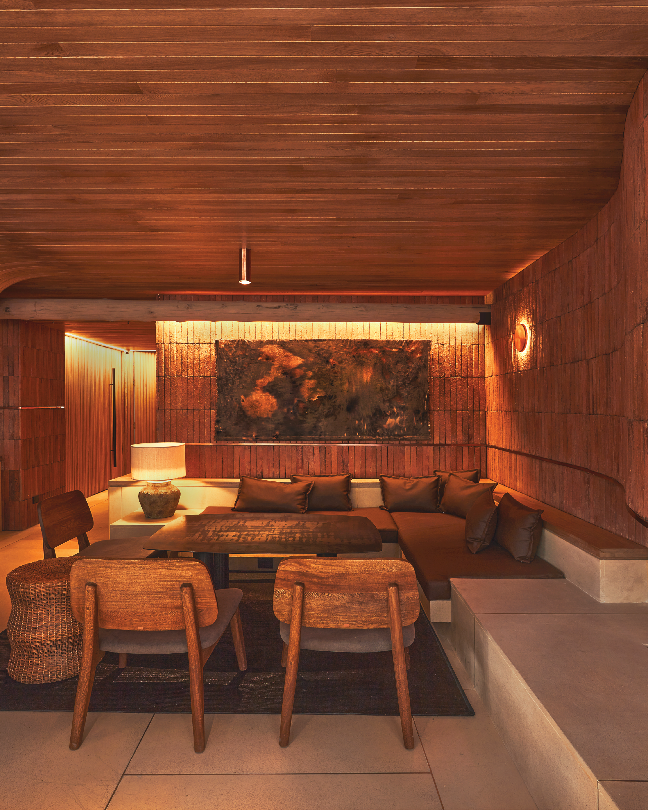 Cuando Martín Mendoza se incorporó al proyecto para desarrollar el interiorismo entendió “que el proyecto era muy arquitectónico y no quise sobreponer cosas que fueran innecesarias. Supe que el interiorismo tenía que trabajar en favor de la arquitectura y del concepto; de ahí también la paleta de color y los materiales naturales maderas, fibras vegetales, terracota, cuero, yute y linos y para contrastar están los detalles en bronce y cobre”. Así, al apreciar el carácter contundente del baño, decidió poner un gran espejo que ocupa toda la pared duplicando el espacio y refleja las puertas de madera que también siguen un programa vertical en medio de la iluminación atmosférica diseñada por Lorenzo que se asoma entre las vigas del techo.