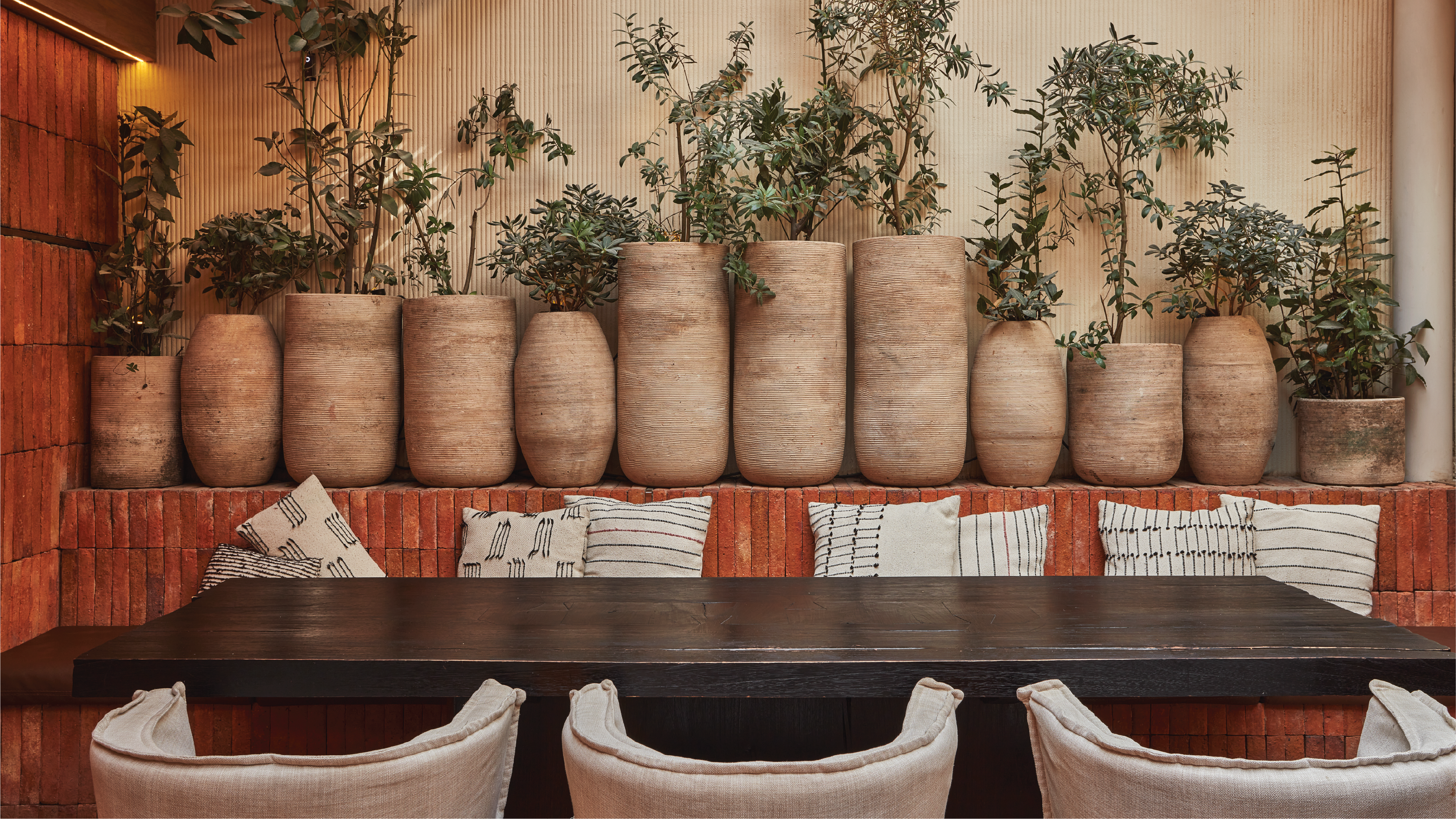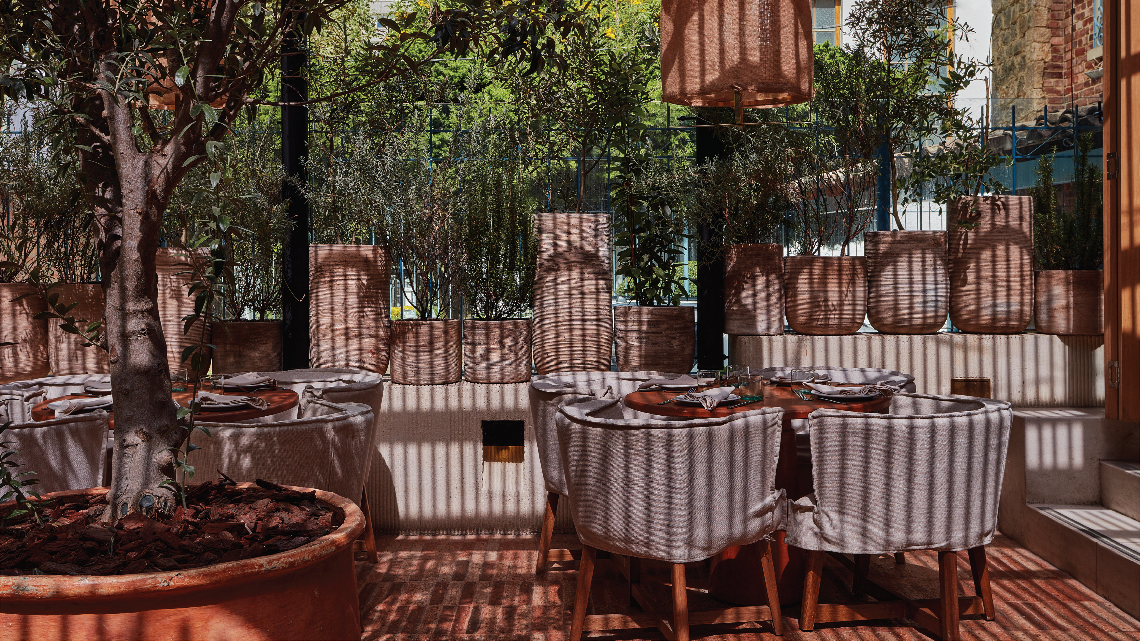Para ambos arquitectos la propuesta estaría incompleta sin la presencia de vegetación, así que inspirados por la que se encuentra en Villa de Leyva, optaron por llevar olivos a la terraza, además de lavanda, romero, pasto salvaje y otras plantas inusuales en un restaurante en Bogotá.