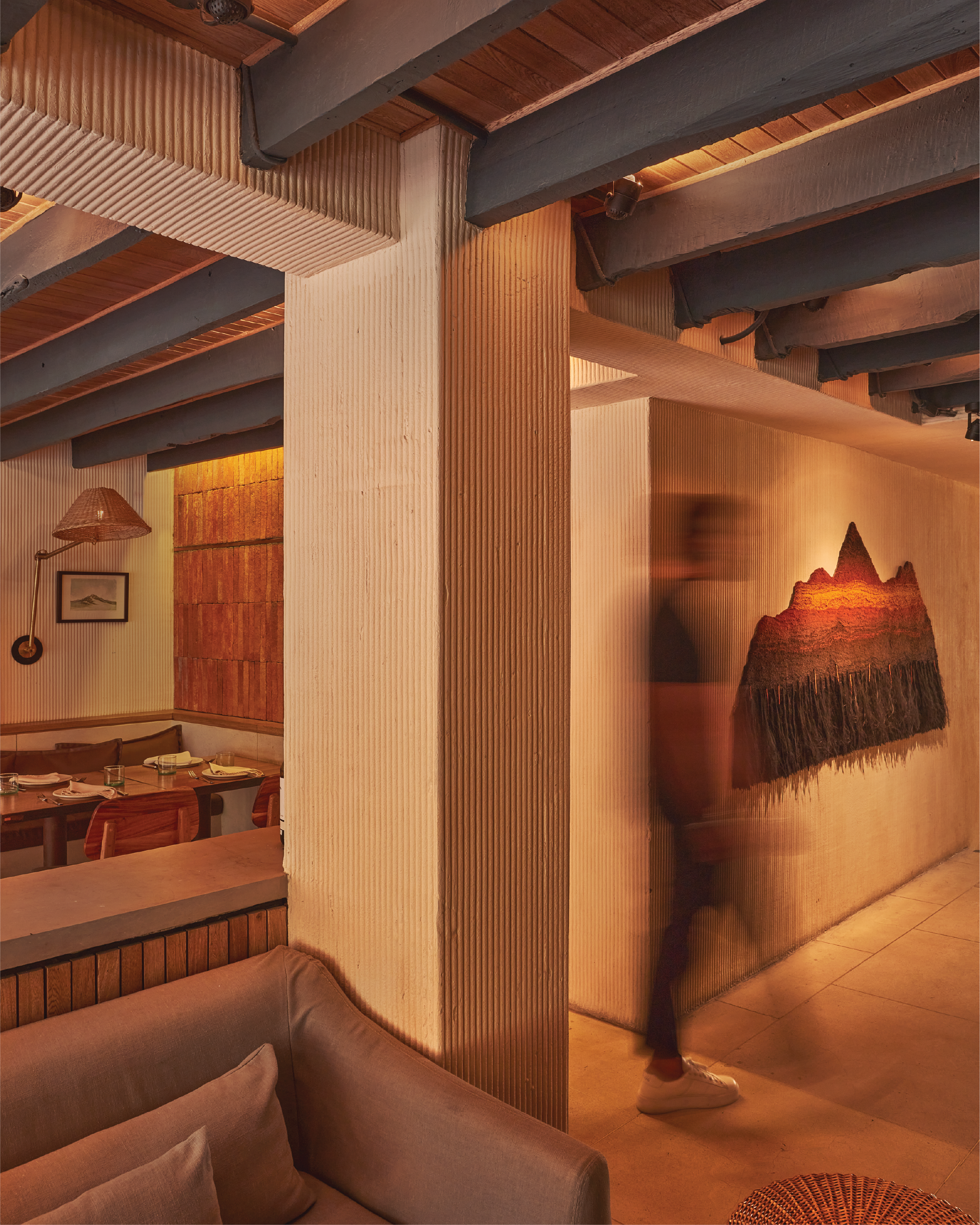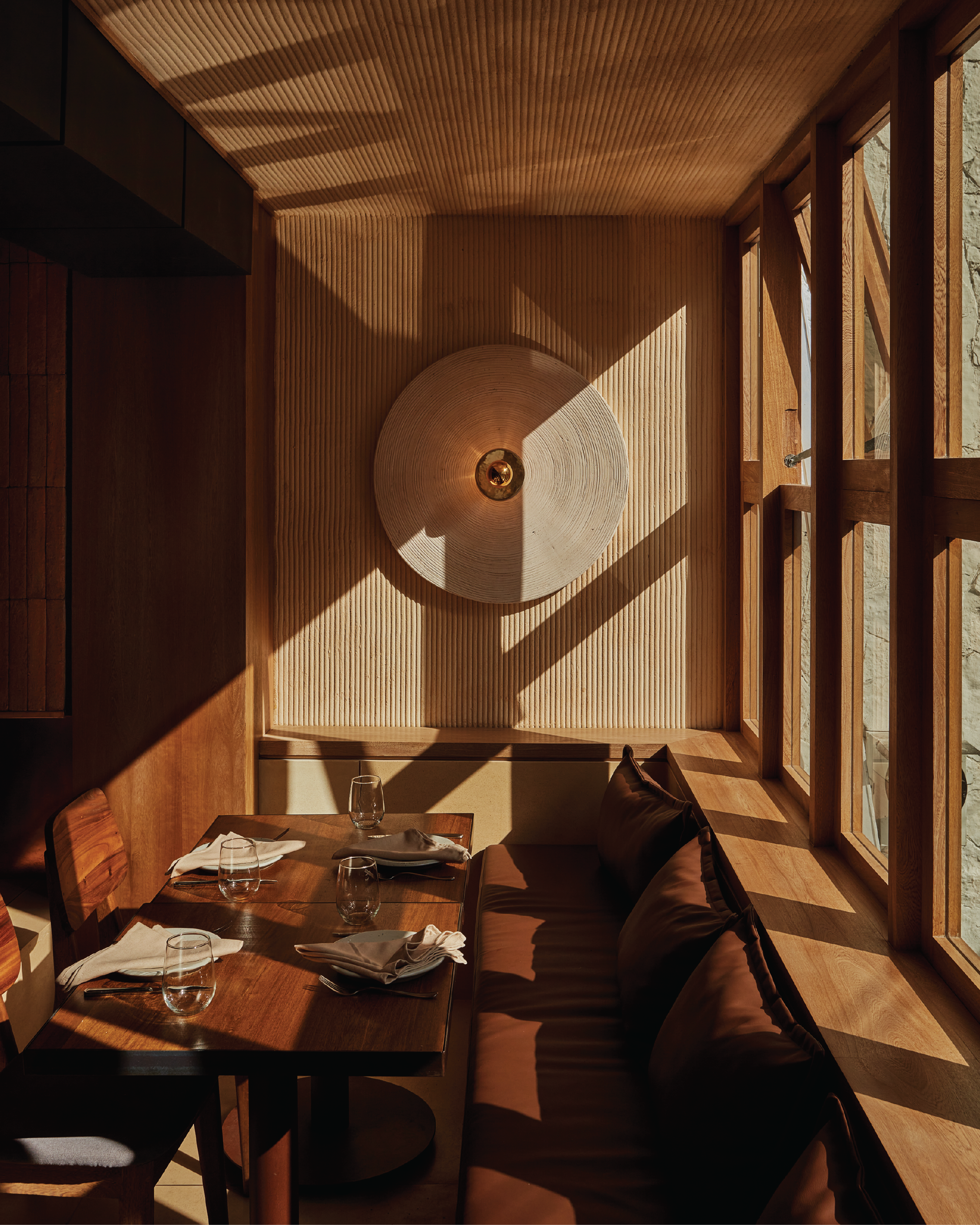 Partiendo del brief del cliente, que buscaba un espacio inspirado en la materialidad y geografía desértica del sur de sur de Estados Unidos y de Baja California al norte de México como marco para su cocina Modern American, Botero se ocupó de traducirlo arquitectónicamente, “sin ser literales y aterrizado a la cultura local a través del uso del ladrillo y el pañete, dos materiales muy cotidianos, con texturas diversas que exploramos con profundidad y que nos permitieron también manejar una paleta de color limitada, pero expresiva”.