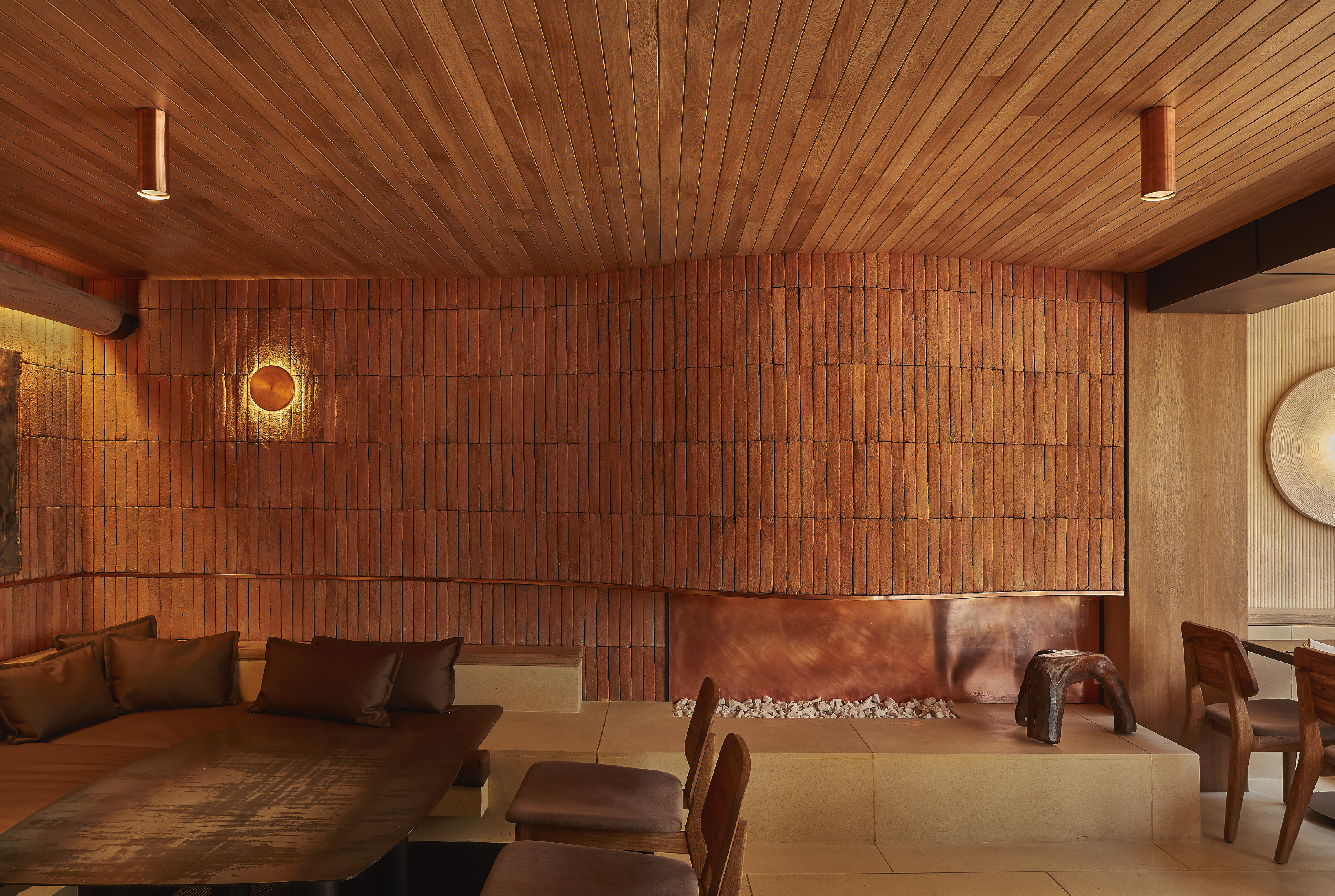 El trabajo con el ladrillo es sobresaliente. Encargado con medidas específicas a un productor artesanal, se colocó verticalmente “empetacado y sin juntas” para alargar los muros y dotarlos de movimiento. A este ladrillo, que encontramos en paredes, pisos, antepechos y estructuras como la base del lavamanos en los baños y la fantástica chimenea curva del segundo piso, los arquitectos decidieron incrustarle juntas y apliques metálicos, ya fuera entre las hileras de estos o como base de las luminarias que lo baña de luz resaltando su color y textura.